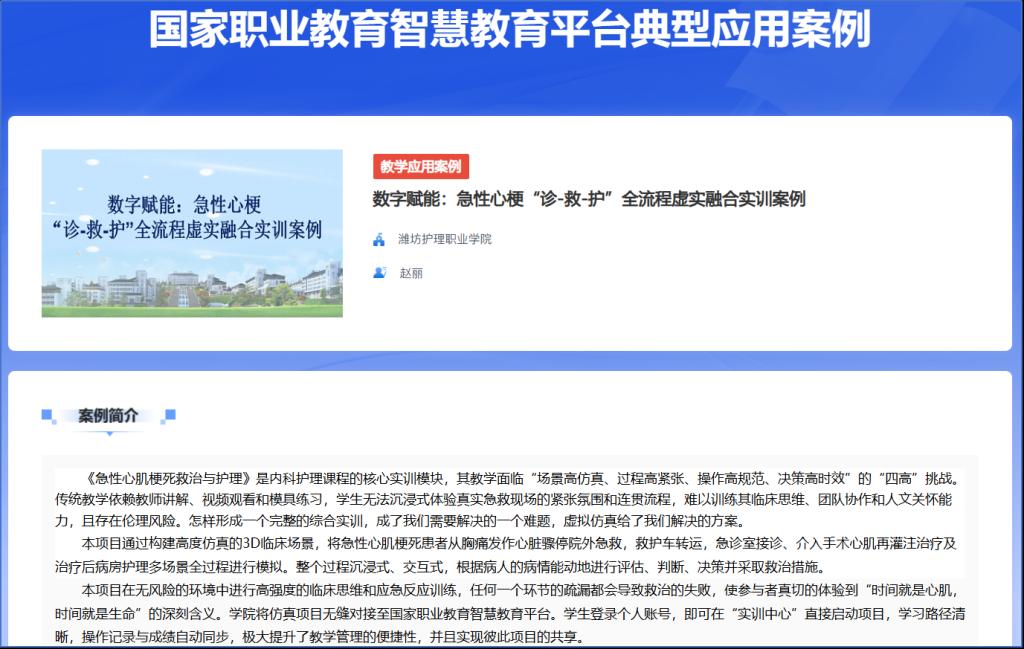 本案例成功跻身全国100项教学应用典型案例之列,为山东省6项入选案例之一。案例聚焦医药卫生领域急性心梗诊疗护理核心能力培养,将数字技术与实训教学深度融合,打造急性心梗“诊-救-护”全流程虚实融合实训模式,打破传统实训的场景、资源限制,让学生在沉浸式、无风险的实训环境中锤炼临床思维与应急处置能力,为职业教育医药卫生类专业智慧教学提供了可复制、可推广的实践范本。