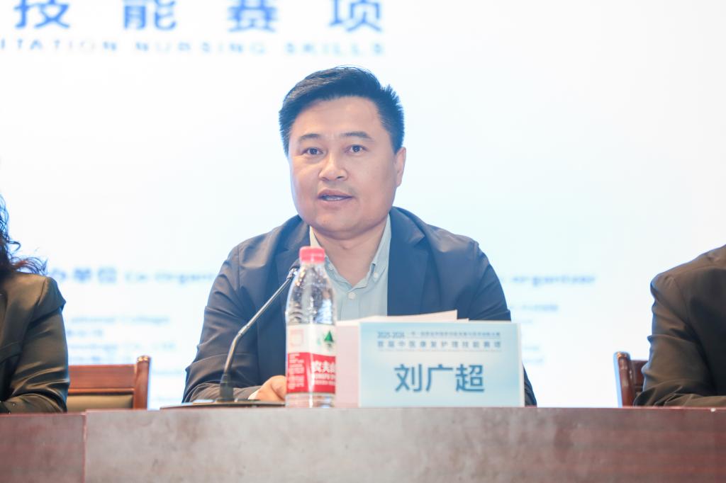 袁元、刘广超先后致辞,他们对大赛开幕表示热烈祝贺,并表示将持续深化校企协同育人,为中医康复护理人才培养与行业高质量发展贡献力量。